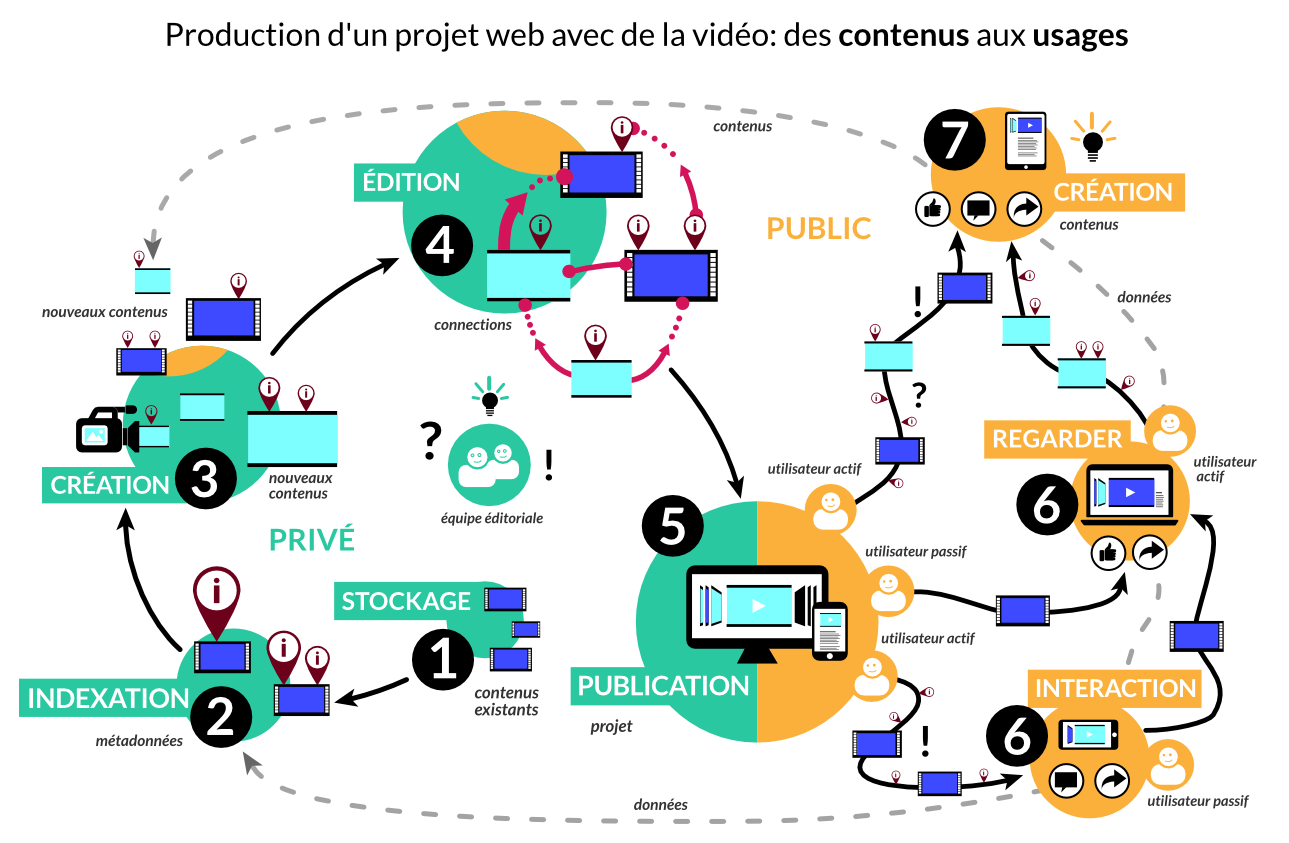En attendant, je met ma main au feu que les résultats obtenus pour amener le public sur un projet vidéo pour le web, en utilisant une méthode inadéquate, ne soient pas bien satisfaisants… - C’est pourquoi le schéma bien coloré et quelque peu « fouillis » de la production de vidéos pour le web inclut volontairement des contenus en amont (les archives) et des usages contributifs en aval (création de nouveaux contenus par les utilisateurs). Pour donner des idées sur comment faire exister ses vidéos sur le web.